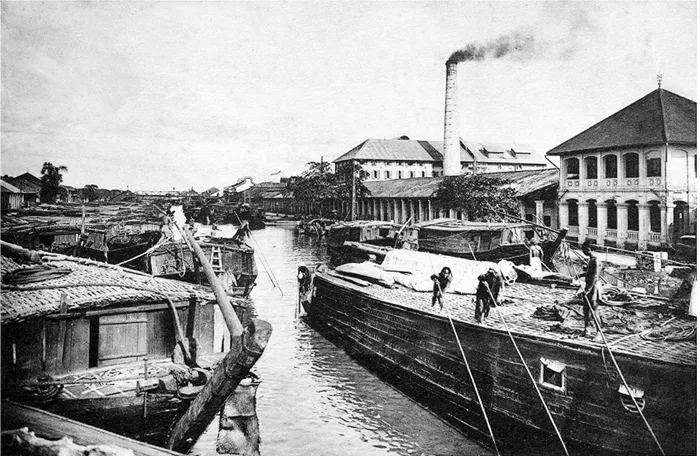 Thuyền bè qua lại trước một nhà máy xay ở vùng ven Sài Gòn - Chợ Lớn. Con kênh trong ảnh chính là kênh Tàu Hũ.