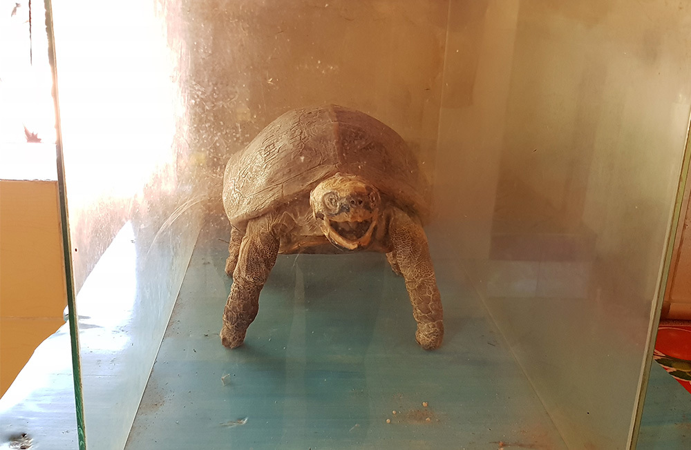 Ngoài những con rùa đang sống, trong chùa Phước Kiển còn có một xác rùa được trưng bày trong tủ kính.