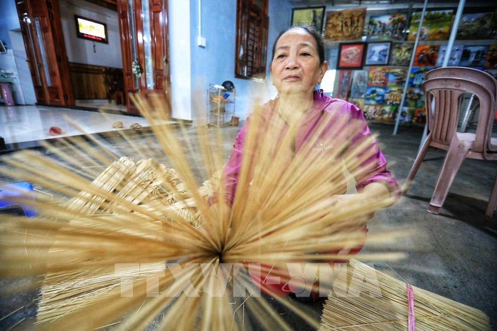 Công đoạn làm lõi hương được làm từ ruột tre chẻ nhỏ đều tăm tắp, phơi nắng nhiều ngày để khô và giòn. Ảnh: Thành Đạt - TTXVN
