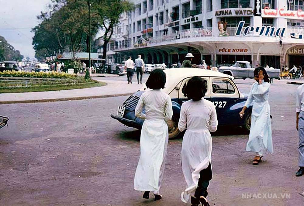 Áo dài thiếu nữ Sài Gòn. Ngày xưa, hình như cứ bước ra đường là phụ nữ Sài Gòn xưa đều mặc áo dài. Bên trái hình là Bùng Binh Bồn Kèn, bên phải là Thương xá TAX một thời kỷ niệm.